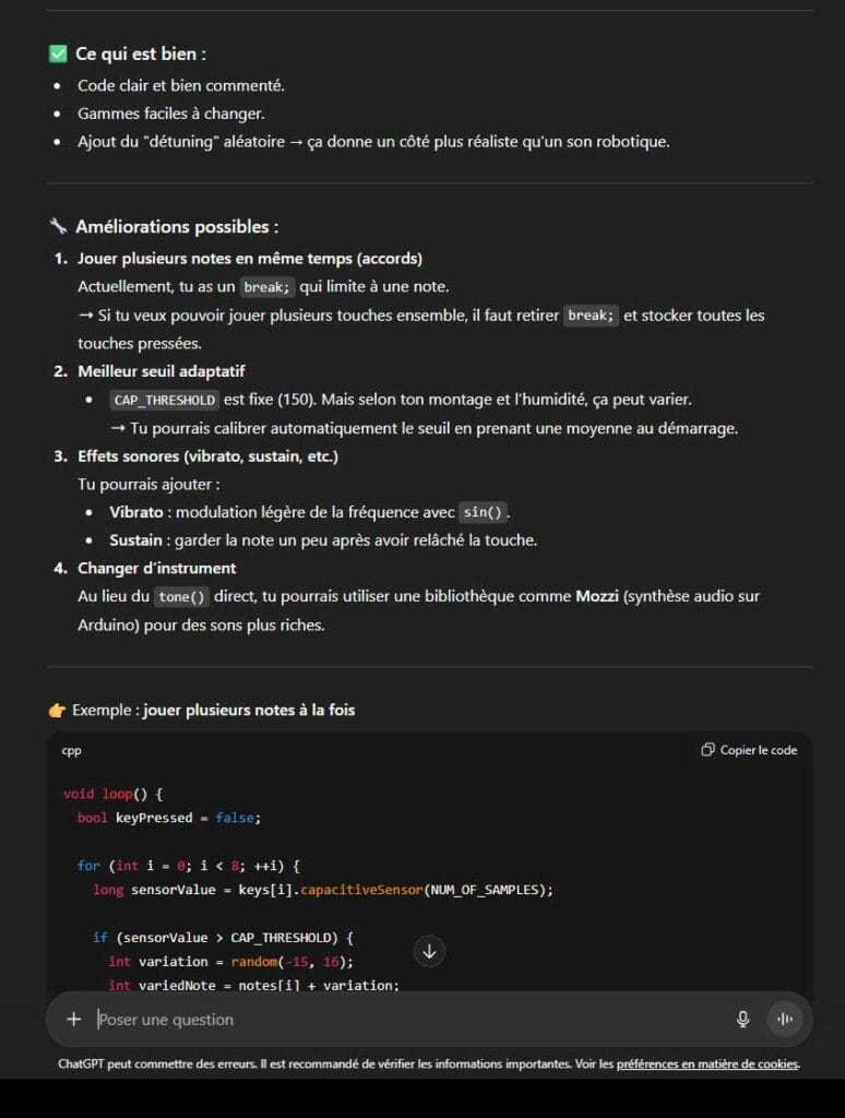 Il s'agissait donc de découvrir les cartes programmables Arduino, les composants électroniques classiques. D'élaborer un code de base pour piano puis de le modifier/pousser/transformer. Pour cette étape, l'utilisation d'une IA facilite dorénavant grandement l'écriture et le déboguage. Nous avons utilisé ChatGpt mais également essayé d'autres modèles LLM pour le test. ( à titre d'exemple, voici une conversation ChatGpt du jour 2 )